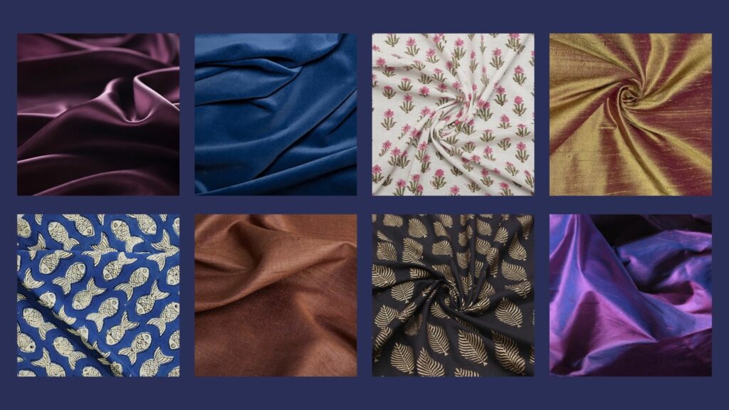 Dark dyed linens and printed cottons, with velvets, shot silks and wools.