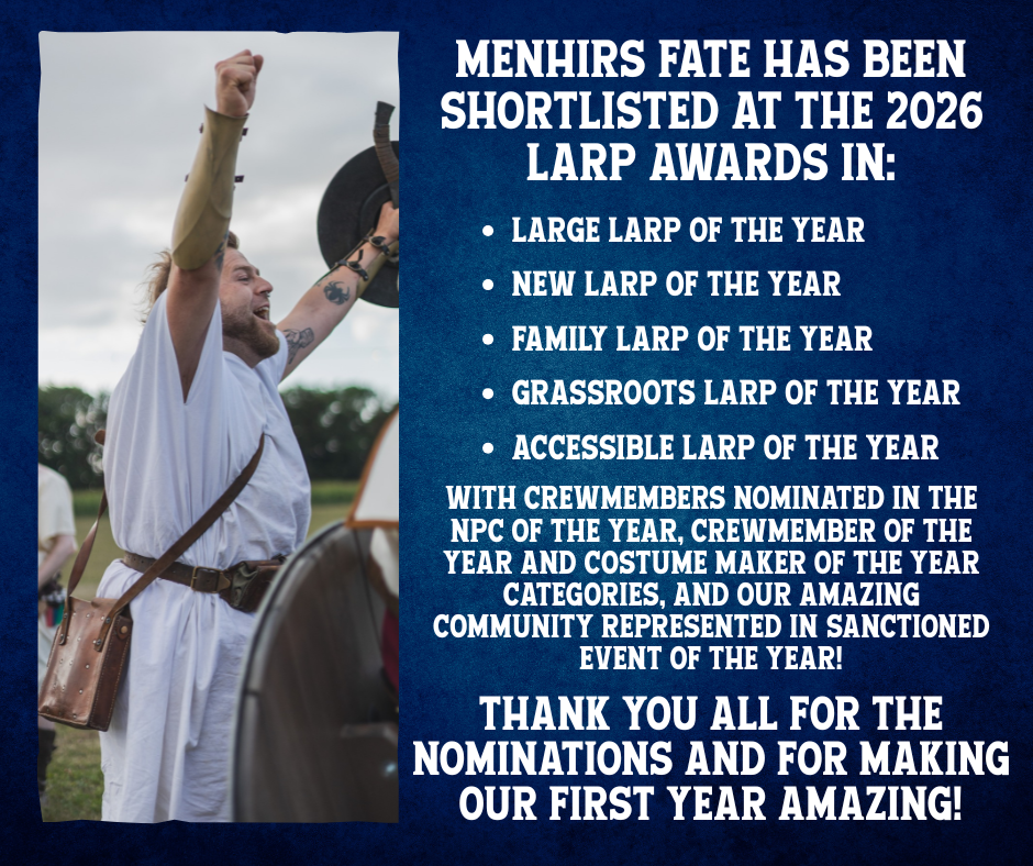 We heard late last night that Menhirs Fate has been shortlisted for a number of UK LARP Awards and just wanted to say a massive thank you to everyone who nominated us! It obviously means a great deal to the whole team that the events had such an impact last year. We were starting a massive undertaking with over 200 volunteers working behind the scenes, so it’s fantastic that so many categories highlight the work they all contributed. We’d like to especially shout out to those crew and players who helped make the games accessible to families, new people to the hobby, minority communities, and all those who have reached out to offer help to others. Larp can be a scary place when first starting out, as well as an expensive one, so this is especially meaningful to us. We are also absolutely thrilled to see so many of our crew nominated: