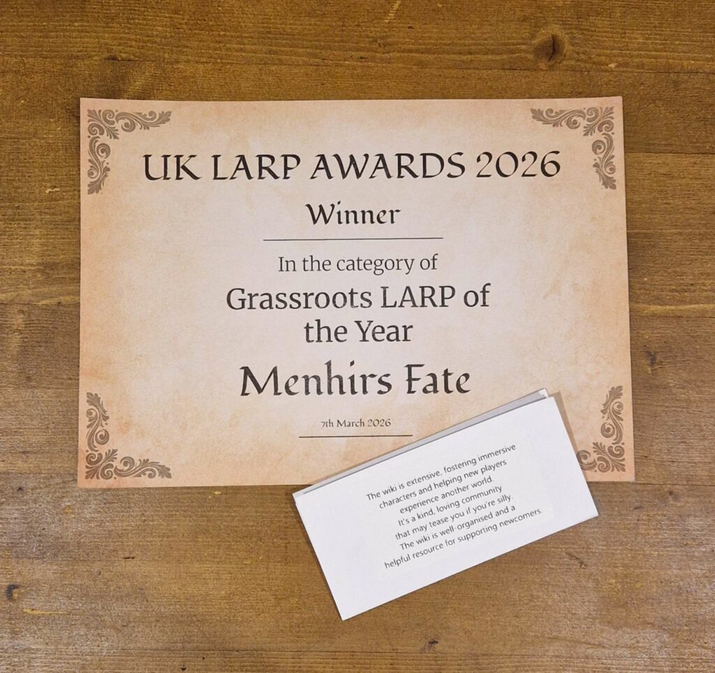 In a world where our hobby isn’t yet understood as an industry, having an award to list on public facing media and communications can open doors and conversations and legitimise business interactions you might otherwise struggle with. Any LARP these days has to work with event spaces, or caterers, and the bigger ones potentially with electricians, site workers, security, medical services, etc. Things like this help that process, and help us grow from a hobby to a recognisable industry.